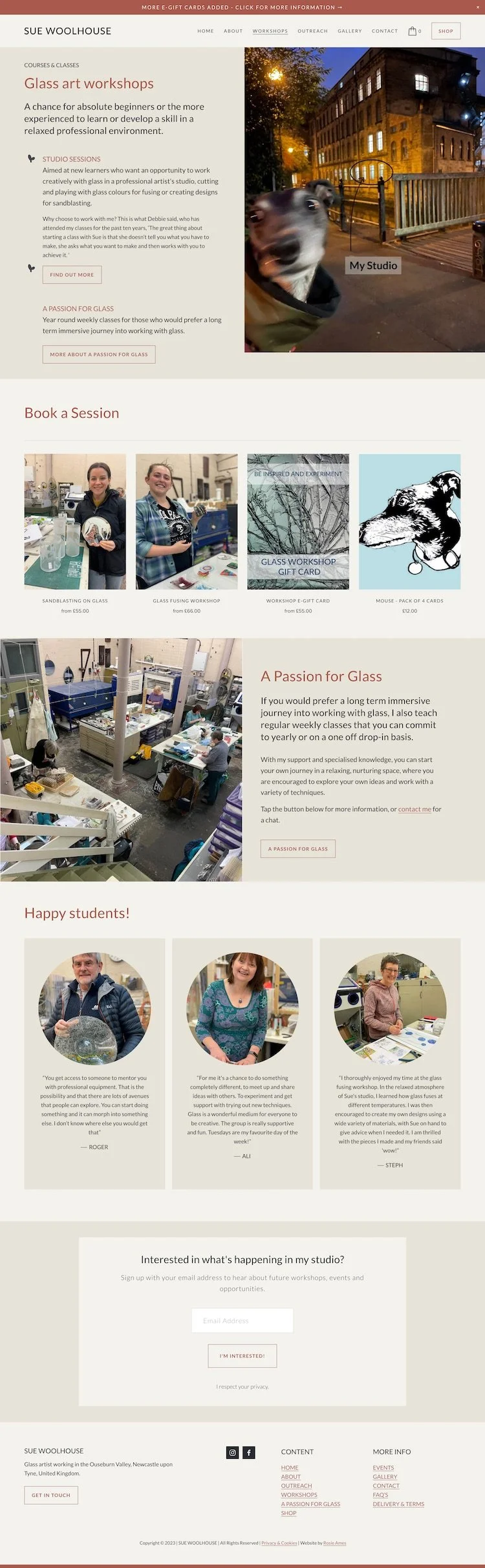 Sue wanted a no nonsense website with a modern edge that, not only showcased her own work, but most importantly promoted her successful glass art workshops with a easy to book and pay system. The website has a robust workshop booking and online shop.
